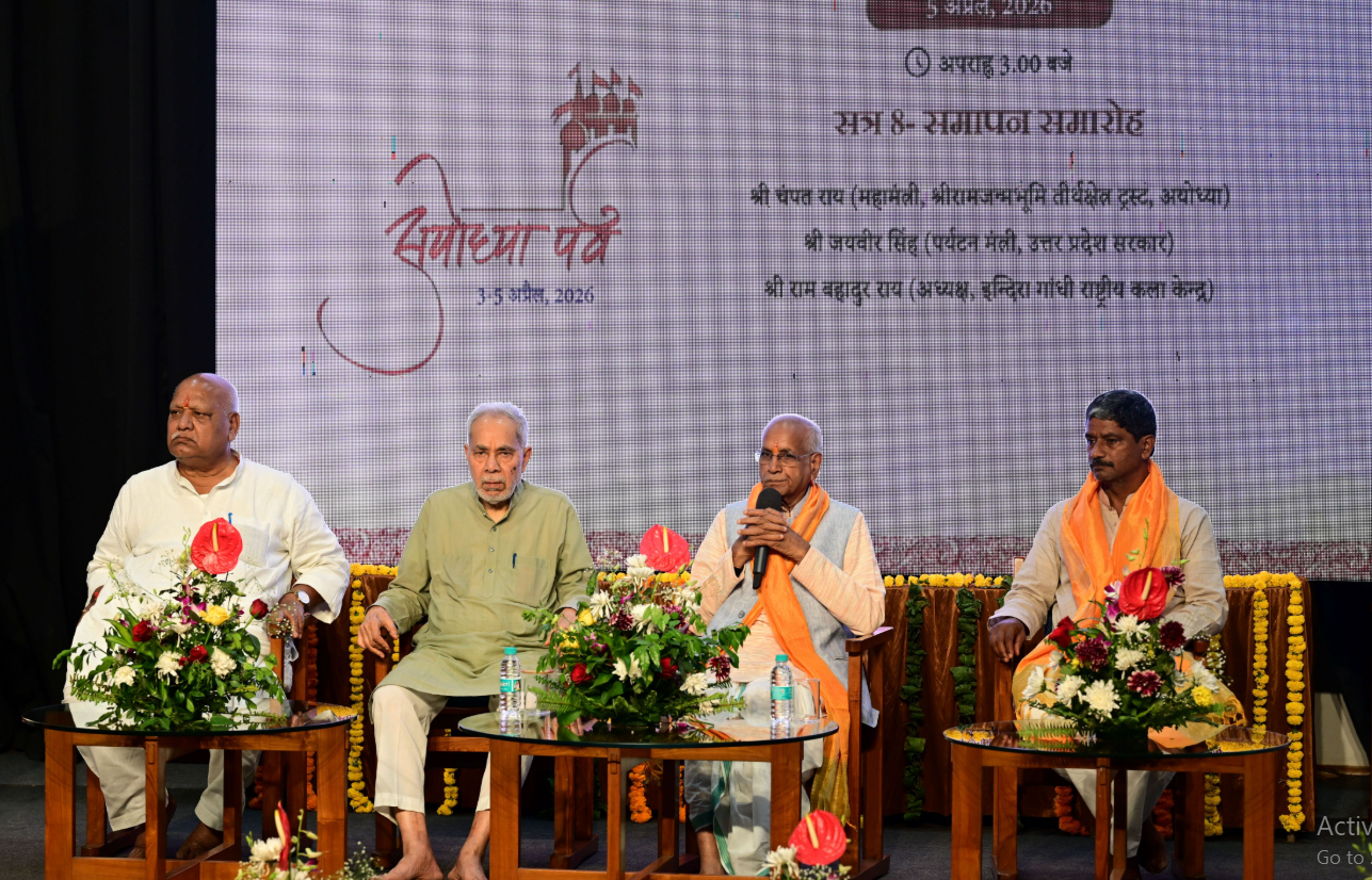 अयोध्या न्यास द्वारा इन्दिरा गांधी राष्ट्रीय कला केन्द्र (आईजीएनसीए) के सहयोग से आयोजित तीन-दिवसीय ‘अयोध्या पर्व’ का समापन गरिमामय वातावरण में सम्पन्न हुआ। समापन सत्र को श्रीरामजन्मभूमि तीर्थक्षेत्र ट्रस्ट के महामंत्री चंपत राय और आईजीएनसीए के अध्यक्ष राम बहादुर राय ने अपनी उपस्थिति से गरिमा प्रदान की। इस अवसर पर अयोध्या पर्व के संयोजक एवं फैज़ाबाद के पूर्व सांसद लल्लू सिंह, अयोध्या न्यास के सचिव राकेश सिंह और वरिष्ठ पत्रकार राजेंद्र पांडेय भी मंच पर उपस्थित रहे।