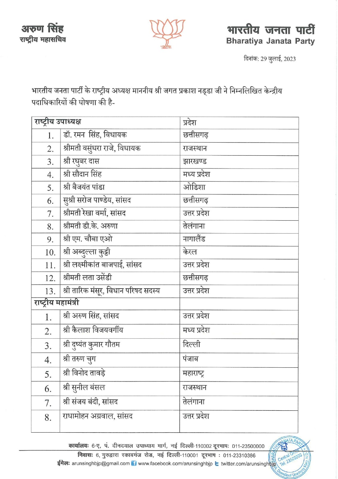 भाजपा की ओर से जारी सूची में राजस्थान की पूर्व मुख्यमंत्री वसुंधरा राजे, छत्तीसगढ़ के पूर्व सीएम डॉ. रमन सिंह, झारखंड के पूर्व मुख्यमंत्री रघुबर दास और सौदान सिंह को पार्टी का राष्ट्रीय उपाध्यक्ष नियुक्त किया गया है। इसके अलावा कैलाश विजयवर्गीय, अरुण सिंह और तरुण चुग को महामंत्री बनाया गया है। इसके साथ ही बीएल संतोष को राष्ट्रीय महामंत्री (संगठन), शिवप्रकाश (लखनऊ) को राष्ट्रीय सह-संगठन महामंत्री, राजेश अग्रवाल (उत्तर प्रदेश) को कोषाध्यक्ष और नरेश बंसल (उत्तराखंड) को सह-कोषाध्यक्ष नियुक्त किया गया है।