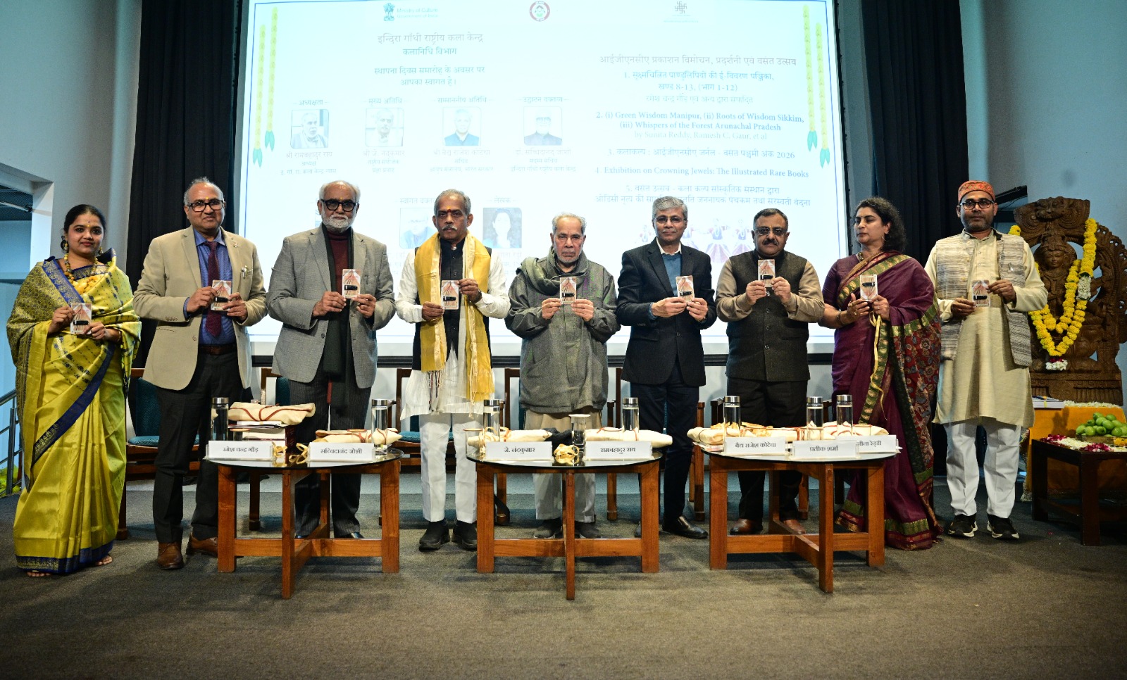 कलानिधि प्रतिष्ठा दिवस समारोह के अंतर्गत आईजीएनसीए द्वारा कई महत्वपूर्ण प्रकाशनों का लोकार्पण किया गया, जिनमें ‘ग्रीन विज़डम : मणिपुर’, ‘रूट्स ऑफ विज़डम : सिक्किम’ तथा ‘व्हिस्पर्स ऑफ़ द फ़ॉरेस्ट : अरुणाचल प्रदेश’ शामिल हैं, जिनके लेखक डॉ. सुनीता रेड्डी, प्रो. (डॉ.) रमेश चंद्र गौड़ सहित अन्य विद्वान हैं। इसके साथ ही, प्रो. (डॉ.) रमेश चंद्र गौड़ एवं उनकी टीम द्वारा सम्पादित डिजिटाइज़्ड पांडुलिपियों का सचित्र सूची-पत्र, खंड 8 से 13 (भाग 1–12) तथा आईजीएनसीए के अर्धवार्षिक जर्नल ‘कलाकल्प’ के वसंत पंचमी अंक, 2026 का भी विमोचन किया गया। इस अवसर पर “क्राउनिंग ज्वेल्स: द इलस्ट्रेटेड रेयर बुक्स” प्रदर्शनी का उद्घाटन भी किया गया। कार्यक्रम का समापन वसंत उत्सव पर आधारित सांस्कृतिक प्रस्तुति के साथ हुआ, जो आईजीएनसीए के शोध और जीवंत परम्पराओं के समन्वित दृष्टिकोण को दर्शाता है।