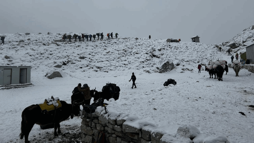 एवरेस्ट बेस कैम्प से पहले यह हमारा अंतिम पड़ाव था। यहाँ पहुँचने के कुछ देर बाद हम बेस कैम्प के लिए रवाना हो गए। बेस कैम्प से वापस आकर हमने रात यहाँ गुज़ारी। हमें सबेरे तीन बजे यहाँ से काला पत्थर के लिए जाना था ताकि हम एवरेस्ट पर सूर्योदय देख सकें। पर लगातार बर्फ़बारी की वजह से हम वहाँ नहीं जा पाए।