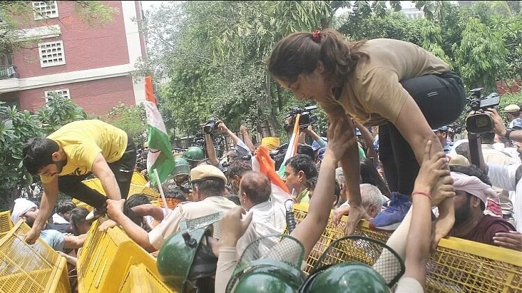 नई दिल्ली जिले के बाराखंभा थाने में तैनात हवलदार माधव की शिकायत पर एफआईआर दर्ज की गई है। माधव के अलावा महिला पुलिसकर्मी प्रियंका समेत घायल 15 पुलिसकर्मियों ने शिकायत दी है। माधव ने शिकायत में कहा है कि जंतर-मंतर पर धरना दे रहे पहलवानों ने सुबह 10.30 बजे प्रेसवार्ता कर घोषणा की कि वे नए संसद भवन के सामने महिला सम्मान महापंचायत करने जा रहे हैं। मौके पर मौजूद वरिष्ठ पुलिस अधिकारियों ने पहलवानों को समझाया कि प्रधानमंत्री नए संसद भवन का उद्घाटन कर रहे है। यह देश के सम्मान व गौरव की बात है। इसके बावजूद पहलवान बजरंग पूनिया, विनेश फोगट व साक्षी मलिक के नेतृत्व में आगे बढ़ने लगे। पहलवान पहली बैरिकेडिंग को कूद गए और फिर दूसरी बैरिकेडिंग को तोड़ दिया। इसके बाद धक्का-मुक्की करते हुए नए संसद भवन की ओर भागने लगे।
