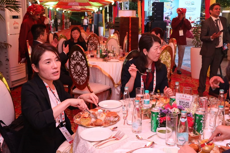 इंदौर में 19 जुलाई से शुरू हुई जी-20 समिट का शुक्रवार देर शाम समापन हुआ। इसके बाद अतिथियों को रात में शहर के प्रसिद्ध फूड मार्केट 56 दुकान में डिनर कराया गया, जहां मेहमानों ने पावभाजी, पनीर टिक्का, बर्गर, गुलाब जामुन, रसमलाई खाई और इन डिशेज की जमकर तारीफ की। इसके साथ ही यहां की कुल्फी और शिकंजी का भी आनंद लिया। उन्होंने यहां एक फाइव स्टार होटल का अफगानिस्तान चिकन टिक्का, मटन गलोटी कबाब, अजवाइन फिश टिक्का, ऑलिव स्टफ्ड बेबी नॉन, उल्टा तवा पराठा, बेबी लच्छा पराठा, दाल मखानी का भी लुत्फ लिया।