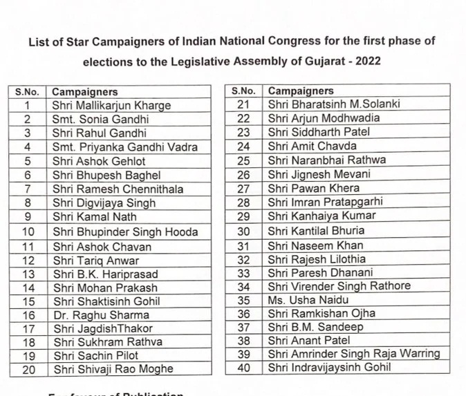 गुजरात में आगामी विधानसभा चुनाव के लिए कांग्रेस ने मंगलवार को अपने स्टार प्रचारकों की सूची जारी कर दी है। इस सूची में पार्टी प्रमुख मल्लिकार्जुन खरगे, यूपीए अध्यक्ष सोनिया गांधी, पार्टी के पूर्व अध्यक्ष राहुल गांधी, महासचिव प्रियंका गांधी वाड्रा, राजस्थान के सीएम अशोक गहलोत, छत्तीसगढ़ के सीएम भूपेश बघेल, सचिन पायलट, जिग्नेश मेवाणी और कन्हैया कुमार के अलावा कई अन्य नेताओं को भी जगह मिली है।