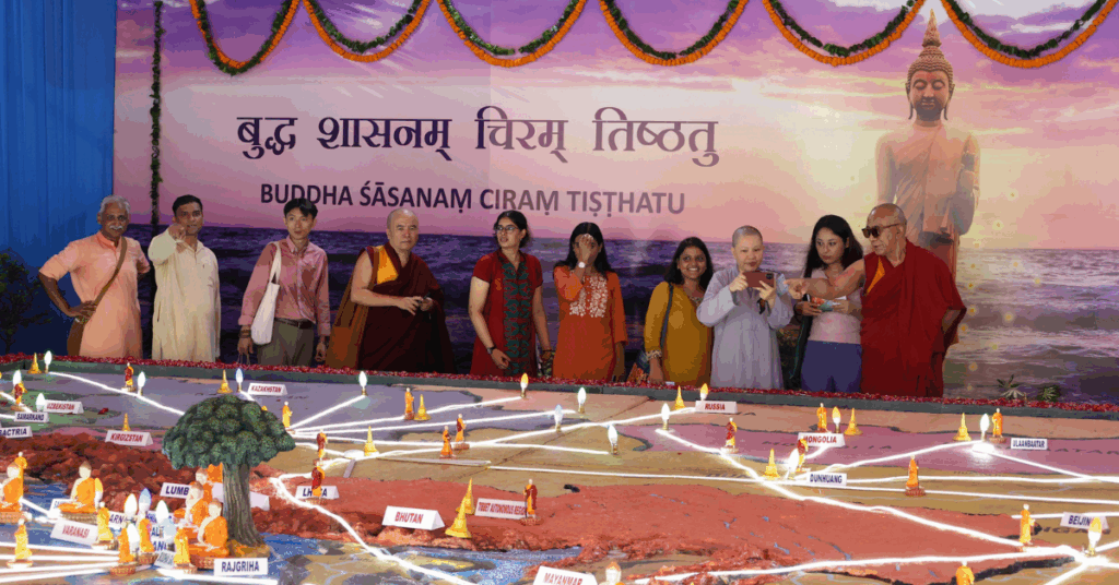 यह मानचित्र भगवान बुद्ध से जुड़े चार पवित्र स्थलों- लुम्बिनी (जन्मस्थान), बोधगया (ज्ञान प्राप्ति स्थल), सारनाथ (धर्मचक्रप्रवर्तन स्थल) और कुशीनगर (महापरिनिर्वाण स्थल) को केवल भौगोलिक बिंदुओं के रूप में ही नहीं, बल्कि जागृति, आध्यात्मिक संचार और स्मृति के जीवंत स्थलों के रूप में भी सामने लाता है। इसके बाद भगवान बुद्ध के परिभ्रमण स्थलों, जैसे- राजगृह, वैशाली, श्रावस्ती, संकाश्यनगर और मथुरा को दिखाया गया है। भगवान बुद्ध के महापरिनिर्वाण के बाद सम्राट अशोक ने पाटलिपुत्र में भगवान बुद्ध के उपदेशों के संगठित रूप में प्रकाशन और प्रसारण के निमित्त बौद्ध विद्वानों की एक बड़ी सभा बुलाई थी, जिसमें निर्णय हुआ कि भगवान बुद्ध के चार आर्य सत्यों, उनके पवित्र सिद्धान्तों और उपदेशों को दिक् दिगन्त में प्रसारित करने के लिए धम्म प्रचारकों को विश्व भर में भेजा जाएगा। फलतः इसमें भारत और समस्त एशिया के उन स्थलों को प्रदर्शित किया गया है, जहां-जहां ये धम्म प्रचारक गए और इनके बाद एशिया में कई स्थान, जो आगे चलकर बौद्ध धर्म के बड़े केन्द्र के रूप में उभरे, उनको दिखाया गया है। यह मथुरा, गांधार, खोतान, लुओयांग, दुनहुआंग, यांगून, अंगकोर वाट, बोरोबुदुर और उसके आगे के क्षेत्रों से होते हुए धर्म की यात्रा का पता लगाता है और इस बात पर प्रकाश डालता है कि कैसे बुद्ध का संदेश रेगिस्तानों, समुद्रों और सभ्यताओं से होकर गुज़रा, भिक्षुओं, तीर्थयात्रियों, विद्वानों और दूतों द्वारा पहुँचाया गया, जिनके प्रयासों ने एशिया के सांस्कृतिक और आध्यात्मिक ताने-बाने को आकार दिया। यह प्रदर्शनी 15 अगस्त तक जनता के लिए खुली रहेगी।