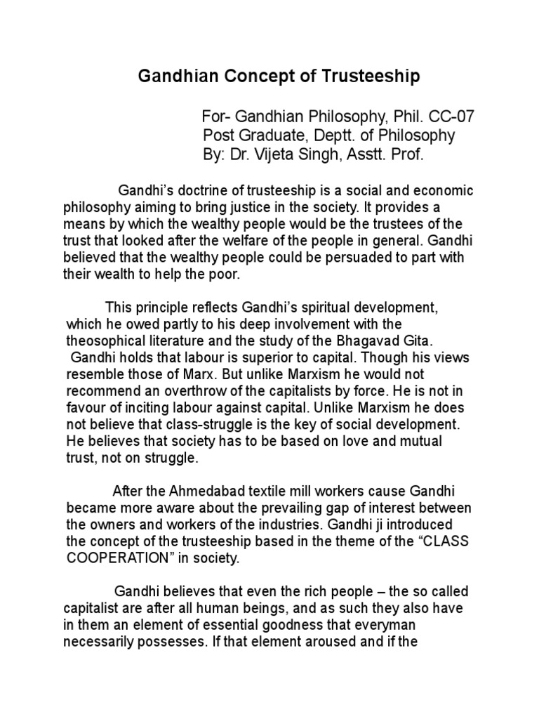 ट्रस्टीशिप को लेकर गाँधी जी का जो सपना या विचार था वह भी 1951 से लागू हो गया है। जब आप कार लेने जाते हैं- भले आप 8 लाख की कार लेने जाओ, 20 लाख की लेने जाओ, 50 लाख या एक करोड़ की कोई कार लेने जाओ- जो पैसा आप वहां देकर आते हैं, क्या वह पूरा उस कंपनी को चला जाता है। अगर हम 50 लाख की गाड़ी खरीद रहे हैं तो कंपनी को मात्र 30 लाख जा रहा है। बाकि 20 लाख तो सरकार को जा रहा है जिससे सरकार को डायरेक्ट टैक्स, इनडायरेक्ट टैक्स मिल रहा है। इससे सरकार देश में गरीबों के लिए वेलफेयर स्कीम चला रही है। इन मूर्खों को कौन समझाए कि कानून को पढ़ने और समझने का तरीका क्या होता है। जब हम जमीन लेने जाते हैं। 50 लाख रूपए की जमीन लेते हैं जिस पर 5 लाख रुपए स्टाम्प ड्यूटी देते हैं। कभी दिमाग में आया कि अगर 50 लाख की जमीन बेची है तो यह 5 लाख रुपए हम गवर्नमेंट को क्यों देते हैं? अरे ये री डिस्ट्रीब्यूशन ऑफ वेल्थ है कि 45 लाख की जो चीज हमें मिलनी चाहिए थी वो हमें 50 लाख की मिल रही है। जीएसटी क्या है जो हम देते हैं। सरकार कहती है कि तुम 2500 रुपए खर्च कर रहे हो तो 250 रुपये हमें दो। किसलिए दो ?…  गरीबों के लिए दो- मकानों के लिए दो- सड़कों के लिए दो- अनाज के लिए दो। ये हमारी ही वेल्थ है इसी को री डिस्ट्रीब्यूट किया जा रहा है और यही कहलाता है- री डिस्ट्रीब्यूशन ऑफ वेल्थ।