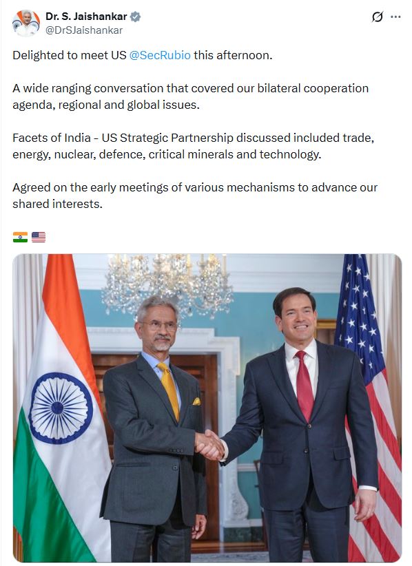 विदेश मंत्री जयशंकर ने बैठक के बाद ‘एक्स’ पर पोस्ट किया, “आज दोपहर अमेरिकी विदेश मंत्री रुबियो से मिलकर बेहद प्रसन्नता हुई। द्विपक्षीय सहयोग के एजेंडे, क्षेत्रीय और वैश्विक मुद्दों पर व्यापक बातचीत हुई।” उन्होंने लिखा, ‘‘भारत-अमेरिका रणनीतिक साझेदारी के जिन पहलुओं पर चर्चा हुई उनमें व्यापार, ऊर्जा, परमाणु, रक्षा, महत्वपूर्ण खनिज और प्रौद्योगिकी शामिल थे। हमारे साझा हितों को आगे बढ़ाने के लिए विभिन्न तंत्रों की बैठकें शीघ्र आयोजित करने पर सहमति बनी।”