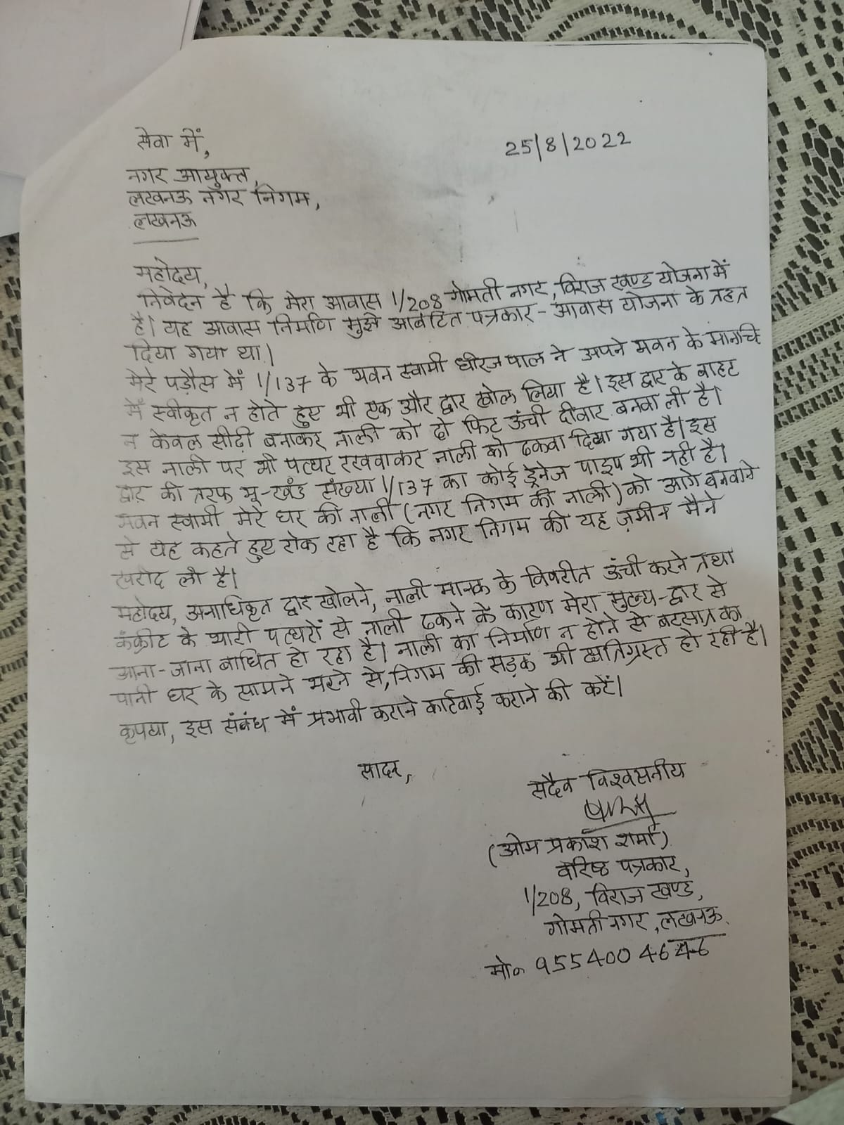 ऐसा ही एक प्रकरण सामने आया है। एक वरिष्ठ पत्रकार की पत्नी सुमनलता द्वारा पुलिस को दिये गये एक शिकायत प्रार्थना पत्र में कहा गया है- “मैं लखनऊ के विराज खंड एक में भवन संख्या 1/208 की निवासिनी हूं। 20 अप्रैल 2023 की शाम मेरे पड़ोस के भवन 1/237 के रहने वाले व्यक्ति ने बिना किसी जानकारी के मेरे आवास की निर्माणाधीन सामग्री को अचानक उठाना शुरू कर दिया। इस बीच जब मैंने इसका कारण पूछा तो उस व्यक्ति ने अभद्र भाषा का प्रयोग करते हुए  हमलावर होकर पत्थर उठाकर मुझ पर फेंका। मैने अचानक हुए इस हमले से  खुद को बचा लिया। इसी से कुपित होकर उस व्यक्ति ने महिला होने के नाते मुझे अकेला पाकर मेरे परिवार को गालियां देना शुरू कर दीं। शिकायती पत्र में महिला ने आरोप लगाया कि-  “जब मैंने उसे शरीफ आदमी की तरह पेश आने की बात कहते हुए प्रतिरोध किया तो धीरज पाल ने मुझे ना केवल मुझे जान से मारने की धमकी दी बल्कि यह कहते हुए भी धमकाया कि मैं तुम्हारे परिवार का विराज खंड में रहना हराम कर दूंगा। यही नहीं उस हमलावर व्यक्ति ने आसपास के लोगों के सामने ही मुझे मारने की नीयत से हाथ में पत्थर लेकर चढ़ाई की। मैं किसी तरह बचकर घर में आ गई और पुलिस को 112 नंबर पर अपनी सुरक्षा के लिए सूचना दी।
