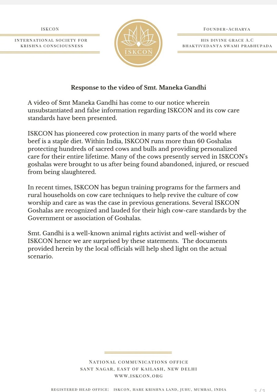 मंदिर प्रशासन ने एक बयान जारी कर कहा कि इस्कॉन दुनिया के कई हिस्सों में गायों का संरक्षण कर रहा है, जहां पर गोमांस एक मुख्य भोजन है। इस्कॉन ने कहा, ‘हम मेनका गांधी के बयान से हैरान हैं क्योंकि वे हमेशा ही इस्कॉन की शुभचिंतक रही हैं। प्रशासन ने कहा कि भारत में इस्कॉन 60 से ज्यादा गौशालाएं चला रहा है। यहां पर सैकड़ों की संख्या में गायों और बैलों की रक्षा की जाती है। उनकी पूरी जिंदगी देखभाल भी होती है। इस्कॉन की गौशालाओं में आने वाली गाय वह होती हैं, जो वध से बचाई गई होती हैं।