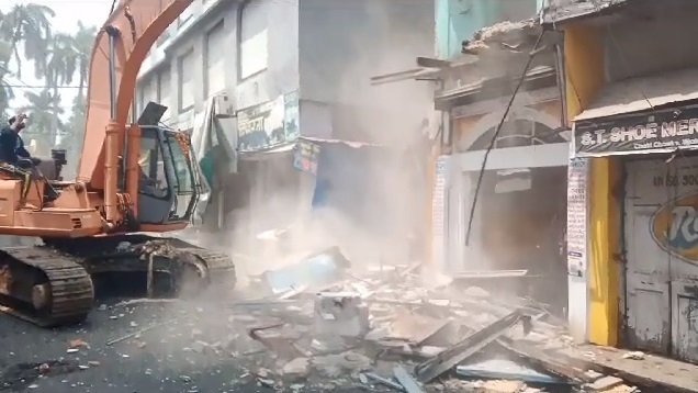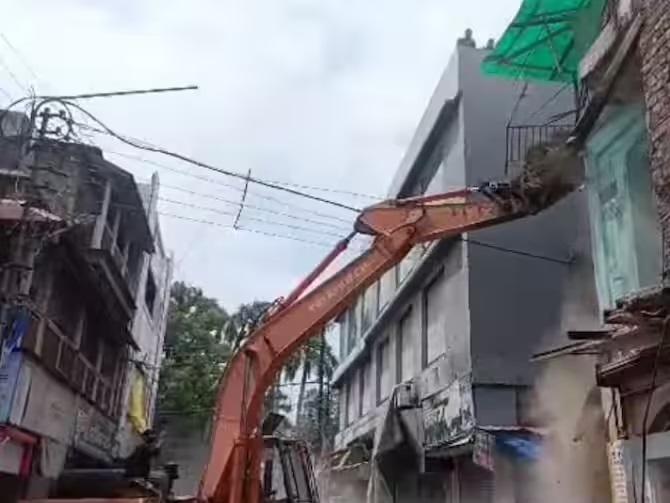 सावन के दूसरे सोमवार को शहर में निकली भगवान महाकाल की सवारी के दौरान घर की छत से भक्‍तों पर थूकने वालों के घर के अवैध निर्माण को बुधवार सुबह जिला प्रशासन ने बुलडोजर चलाकर ढहा दिया। सुबह प्रशासन और पुलिस की टीम ढोल-नगाड़ों के साथ बुलडोजर लेकर कार्रवाई करने पहुंची। इस दौरान पूरे क्षेत्र में बड़ी संख्या में पुलिस बल तैनात किया गया। इसके बाद वरिष्ठ अधिकारियों की मौजूदगी में आरोपितों के घरों के अवैध हिस्से को जमींदोज कर दिया गया।दरअसल, सावन के दूसरे सोमवार को नगर में भगवान महाकाल की सवारी निकाली जा रही थी। इस दौरान शाम 6.30 बजे टंकी चौक मार्ग स्थित बिल्डिंग से‎ वर्ग विशेष के तीन युवकों ने पानी का कुल्ला कर सवारी में शामिल भक्‍तों पर थूका था। इसका वीडियो सोशल मीडिया पर वायरल होने के बाद ‎बजरंग दल के जिला संयोजक अंकित चौबे और इंदौर के वार्ड 19 के भाजपा पार्षद मासूम जायसवाल समेत कई कार्यकर्ता रात 9 बजे खाराकुआं थाने पहुंचे और आरोपितों के खिलाफ कार्रवाई की मांग की। इसके बाद पुलिस सक्रिय हुई और रात में एक बालिग समेत‎ तीन युवकों को गिरफ्तार किया। आरोपितों के खिलाफ‎ धार्मिक भावना को ठेस पहुंचाने‎ और सद्भाव बिगाड़ने समेत अन्य‎ धाराओं में केस दर्ज किया गया है।