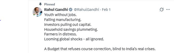 राहुल गांधी ने कहा कि केंद्रीय बजट ‘भारत के असली संकटों से आंखें मूंदे हुए’ है। उन्होंने सोशल मीडिया प्लेटफ़ॉर्म एक्स पर कहा कि देश में युवा बेरोज़गार हैं, मैन्युफैक्चरिंग में गिरावट आ रही है और किसान संकट में हैं, लेकिन बजट में इन मुद्दों को नज़रअंदाज़ किया गया है। युवा बिना नौकरी के हैं. मैन्युफैक्चरिंग गिर रही है. निवेशक पूंजी निकाल रहे हैं. घरेलू बचत कम हो रही है। किसान संकट में हैं. वैश्विक स्तर पर बड़े झटकों की आशंका है, लेकिन इन सबको अनदेखा किया गया है।” उन्होंने लिखा, “यह ऐसा बजट है जो दिशा सुधार से इनकार करता है और भारत के वास्तविक संकटों को नहीं देखता।”