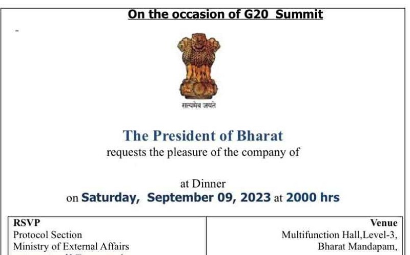राष्ट्रपति द्रौपदी मुर्मू की ओर से जी20 देशों के नेताओं को 9 सितंबर को ‘भारत मंडपम’ में रात्रिभोज के लिए भेजे गए आधिकारिक निमंत्रण पत्र में इस बार उनके लिए ‘प्रेसीडेंट ऑफ भारत’ के संबोधन का प्रयोग किया गया है। इससे पहले प्रेसीडेंट ऑफ इंडिया लिखे जाने की पंरपरा थी।राष्ट्रपति भवन से आधिकारिक निमंत्रण पत्र में भारत शब्द के प्रयोग के बाद पक्ष विपक्ष की राजनीति आरंभ हो गई है। कांग्रेस नेता जयराम रमेश ने कहा कि राष्ट्रपति भवन ने 9 सितंबर को जी20 रात्रिभोज के लिए ‘प्रेसीडेंट ऑफ भारत’ के नाम पर निमंत्रण भेजा है। संविधान में अनुच्छेद एक के अनुसार, “भारत, जो इंडिया है, राज्यों का एक संघ होगा लेकिन अब इस ‘राज्यों के संघ’ पर भी हमला हो रहा है। उन्होंने आगे लिखा कि मोदी इतिहास को विकृत करना और इंडिया को विभाजित करना जारी रख सकते हैं, जो भारत है, जो राज्यों का संघ है। लेकिन हम विचलित नहीं होंगे। आख़िर क्या है आईएनडीआईए पार्टियों का उद्देश्य यही है। यह भारत है-सद्भाव, मैत्री, मेल-मिलाप और विश्वास लाओ। जुड़ेगा भारत, जीतेगा इंडिया!।