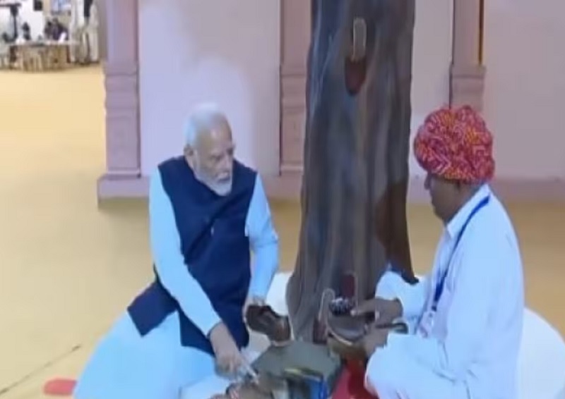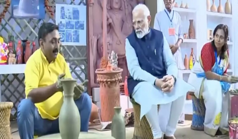 एक्सपो सेंटर में आने के बाद पीएम मोदी ने यहां सबसे पहले जूता-चप्पल बनाने वाले कारीगरों से मुलाकात की है। इस दौरान पीएम मोदी मोचियों से बातचीत करते नजर आए। पीएम मोदी मोचियों द्वारा बनाए गए जूते को हाथ में लेकर निहारते और कारीगरों से बातचीत करते नजर आए। एक्सपो सेंटर में पीएम मोदी ने सिर्फ मोचियों से ही नहीं बल्कि मिट्टी की शिल्पकारी करने वाले कुम्हारों से भी मुलाकात की है। इस दौरान पीएम मोदी ने कुम्हारों से उनकी कला के बारे में पूछा औऱ जाना। (एएमएपी)