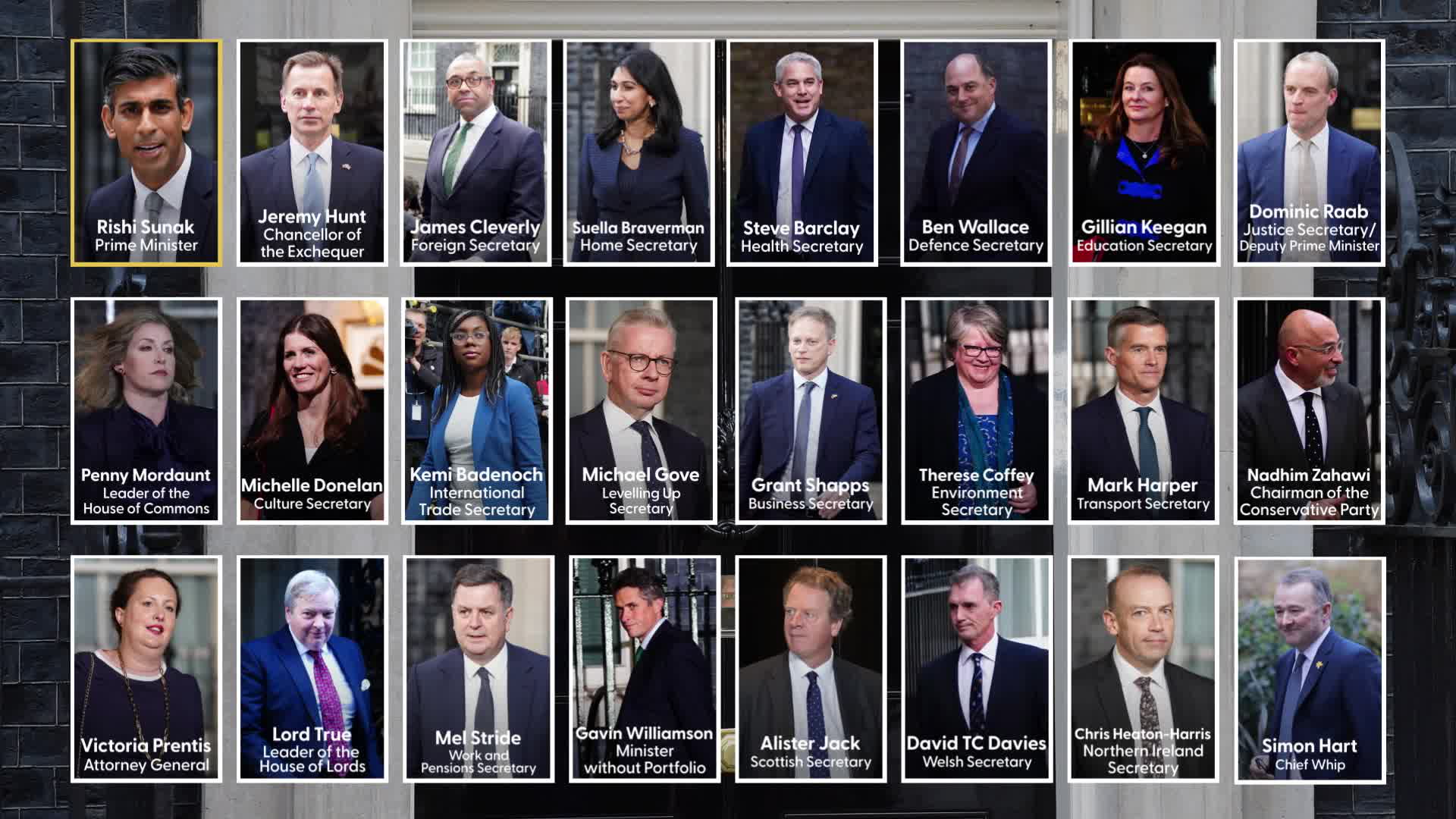 प्रधानमंत्री सुनक ने जेरेमी हंट को चांसलर नियुक्त किया है। डोमिनिक राब उप प्रधानमंत्री और न्याय या कानून मंत्री की भूमिका में रहेंगे। जेम्स क्लीवर्ली और बेन वालेस विदेश मंत्री और रक्षा मंत्री बने रहेंगे। साइमन हार्ट नए मुख्य सचेतक बनाए गए हैं, वहीं नादिम जाहावी पार्टी अध्यक्ष के मंत्री के रूप में बिना विभाग के मंत्री रहेंगे। मिशेल डोनेलन के पास संस्कृति, मीडिया और खेल मंत्री की जिम्मेदारी बनी रहेगी, वहीं क्रिस हेटन-हैरिस उत्तरी आयरलैंड के राज्य मंत्री बने रहेंगे। (एएमएपी)
