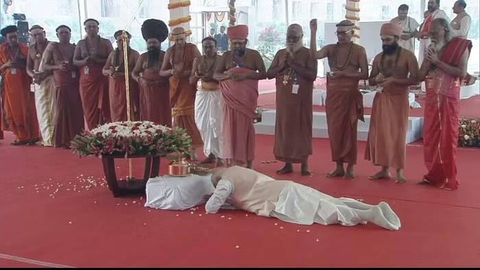 सेंगोल के सामने दंडवत हुए मोदी